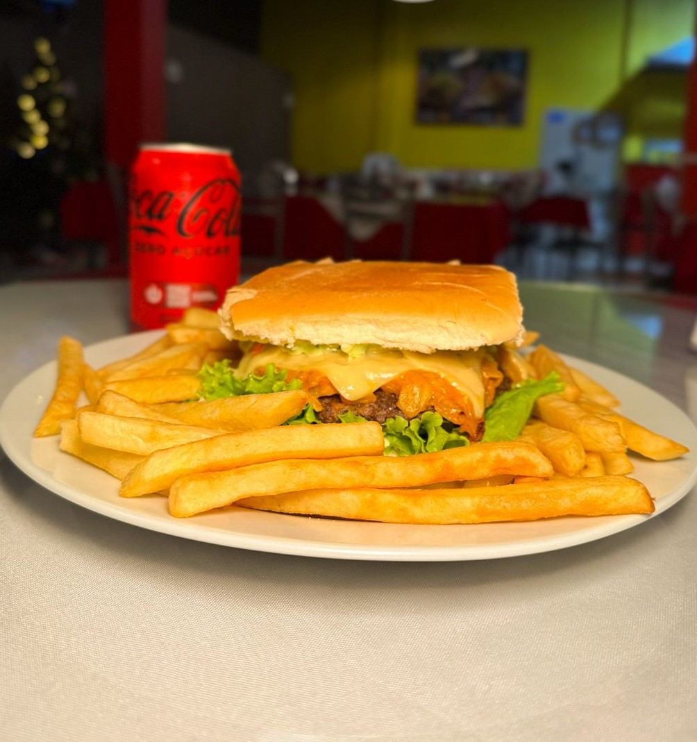 Carne (Tempero Especial), Queijo, Cheddar, Cebola Na Chapa, Tomate, Alface e Maionese + Mini Fritas Obs: Culinária Árabe. *Coca cola não acompanha o lanche*
